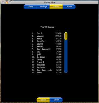 Neven Liteは英語のほか日本語やフランス語など7か国語に対応しているので、外国語を勉強中の人にも実用的です。言語の切り替えも同じく「Settings」から行えます。ただ、日本語を選択した場合はアルファベットがひらがなに置き換わるわけではなく、「椅子(isu)」「竹刀(sinai)」など、アルファベットを使って日本語の単語を作っていきます。ゲームの得点は自動的に保存され、「Scores」からはオンラインのラインキングと、PC内でのランキングが見られるようになっています。